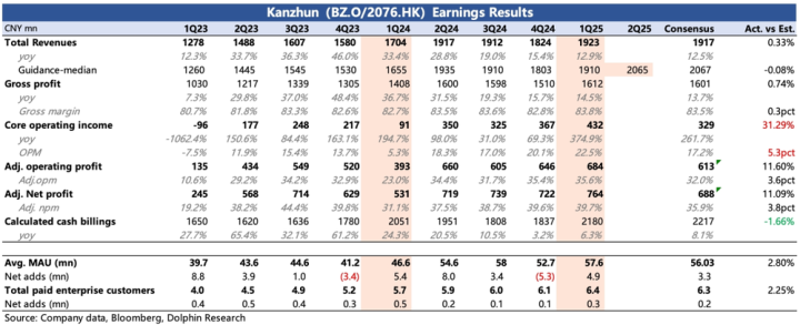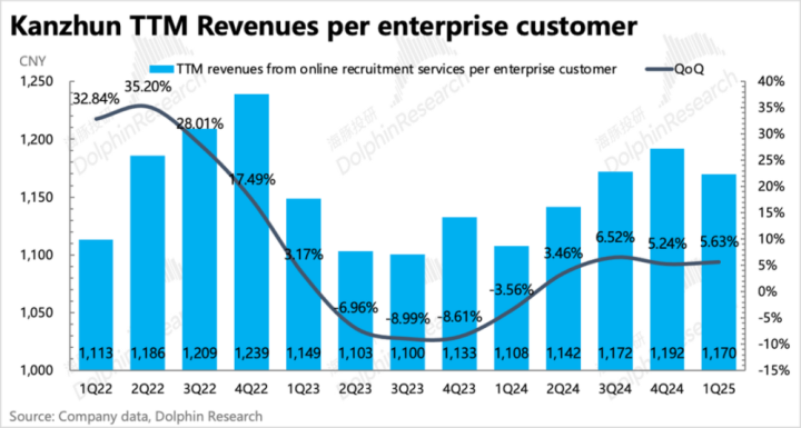 2.ToB招聘环境还没走出底部:但企业端的环境压力就有点大了。一季度收入增长13%,其实还略超一个月前已经向下调整过后的市场预期。但从二季度指引(增速6.9%-8.5%)来看,呈现压力边际递增的趋势。递延收入和流水两个指标也能同样印证上述的底部压力,一季度计算流水同比增长只有6.3%,相比上季度增速看上去回暖主要是基数问题。