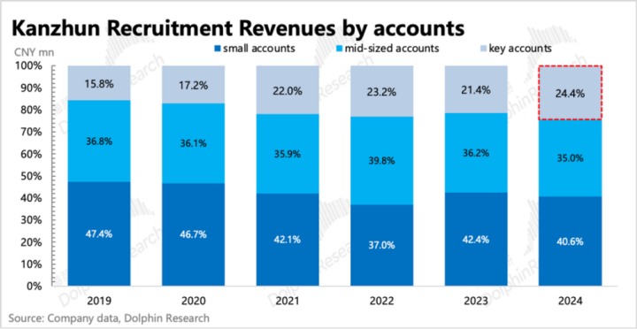 上述不同企业的不同应对策略特征,在近两年的经济下行期非常明显。2024年付费企业中,大企业(KeyAccounts)的收入贡献占比提升很明显,相比23年直接拉了3pct。