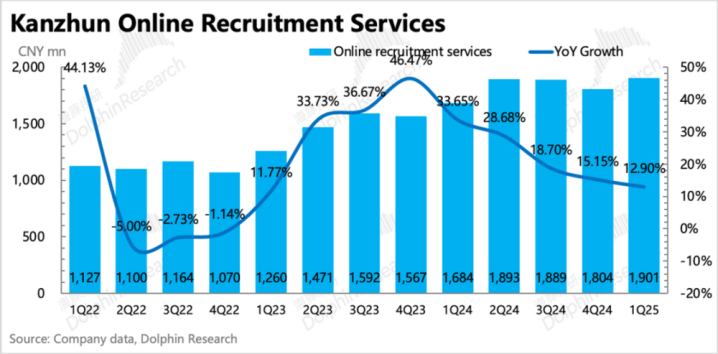 一季度总收入19.2亿,同比增长12.7%,如果参考一个月前部分头部机构有所下调后的预期,这个增速还略微有点超预期。其中ToB端网络招聘服务收入19亿,同比增长12.9%。其他收入0.22亿,走过了高增长红利期。