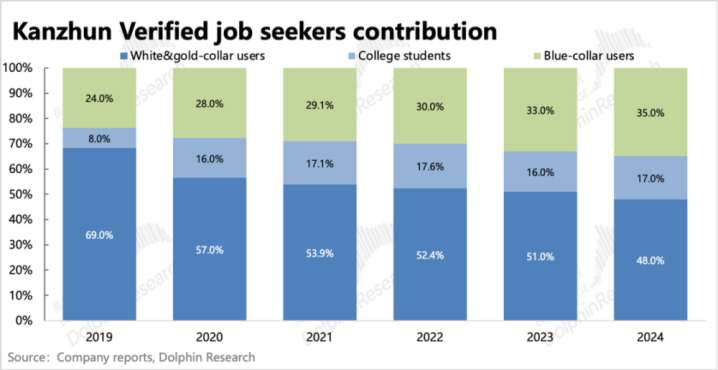 从年度数据来看,BOSS直聘的新增流量主要来源于蓝领。蓝领行业近几年来发展比较快,且用户工作流动性大,无论是求职方还是招聘方,借助中介平台来撮合招聘的需求相对较高。其次蓝领行业本身线上招聘渗透率较低,因此从边际变化来看,用户规模的扩张也会比较明显。