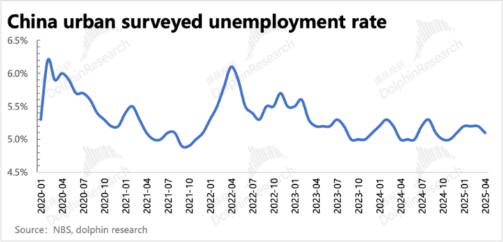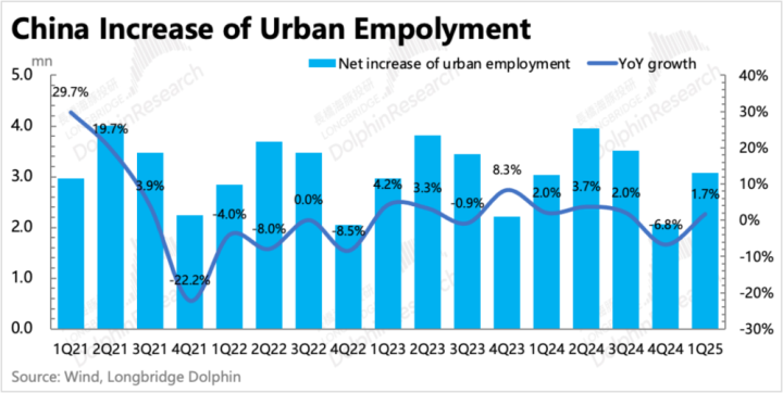 一季度有春招较早的影响因素,再加上环境并未如一开始预期得那么差,因此城镇就业人口反而同比新增了1.7%,环比看,相比去年季节性间的增幅略微好一些。