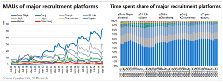 参考QM数据,我们将BOSS直聘放到行业对比来看,BOSS直聘流量份额保持稳定领先。BOSS直聘、51Job以及智联招聘基本占据在线招聘平台C端流量的三巨头地位。