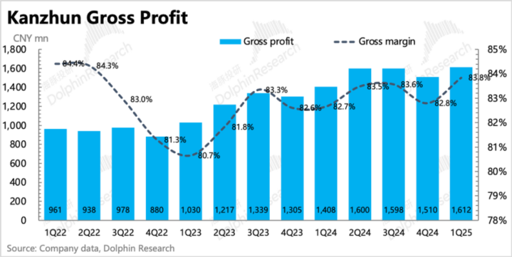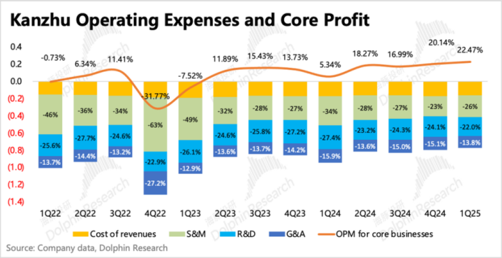 一季度BOSS直聘毛利率稳定在83.8%,一般情况下,除了季节性波动外,基本保持稳定。核心主业的经营利润(收入-成本-销售费用-研发费用-行政费用)实现4.3亿超预期,利润率22.5%,同比去年的5.3%大幅优化了17pct。