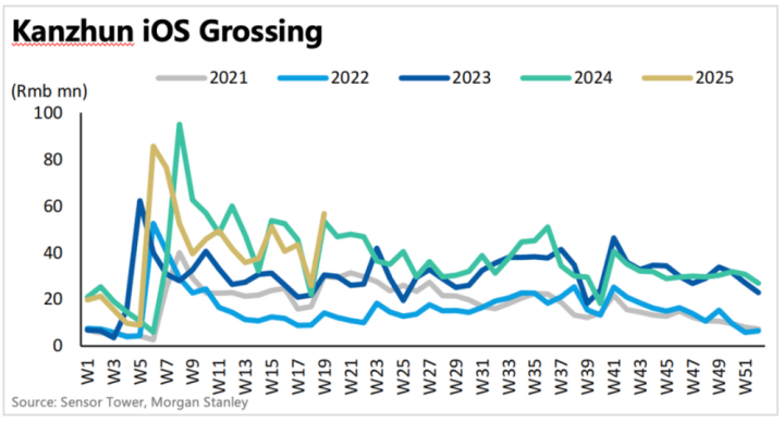 一季度计算得流水增速是6%,相比上季度回暖主要是基数问题。环比来看,压力变化如同去年一季度,即较往年逊色。参考SensorTower的流水数据,今年开年以来的表现,其实和去年差不多,流水增速压力并不小。
